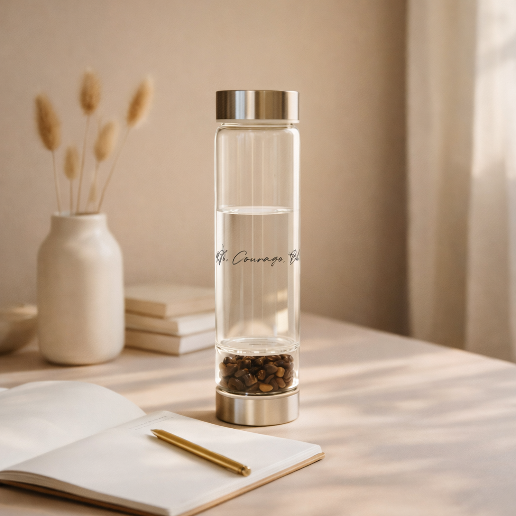 Tiger’s Eye is known for boosting confidence, courage, and mental clarity. It helps balance emotions, sharpen focus, and turn intentions into actionable energy — supporting you to move forward with strength and determination. Ideal For Those seeking confidence, motivation, and mental clarity. Perfect for professionals, students, or anyone tackling challenges and making decisions with intention. Carry your Tiger’s Eye bottle during workdays, study sessions, or creative projects. Sip mindfully as a reminder to stay grounded, centered, and confident throughout your daily pursuits. Cleansing & Charging Rinse gently under running water and allow to dry naturally. Recharge under sunlight or on a bed of clear quartz to restore its bold energy.